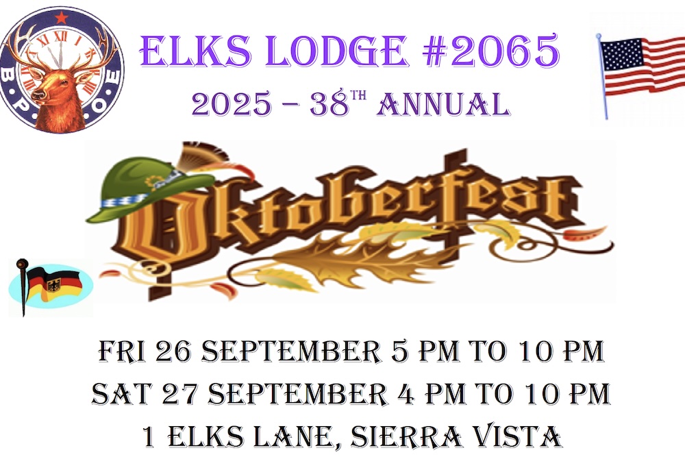 Open to the Public ANNUAL ELKS OKTOBERFEST: We are kicking off our Annual Lodge Oktoberfest on Friday, 27 September 2023- 4:00pm to 11:00pm, and on Saturday, 29 September from 2:00pm to 11:00pm (rain or shine). We’ll have music by the Sierra Vista Community...